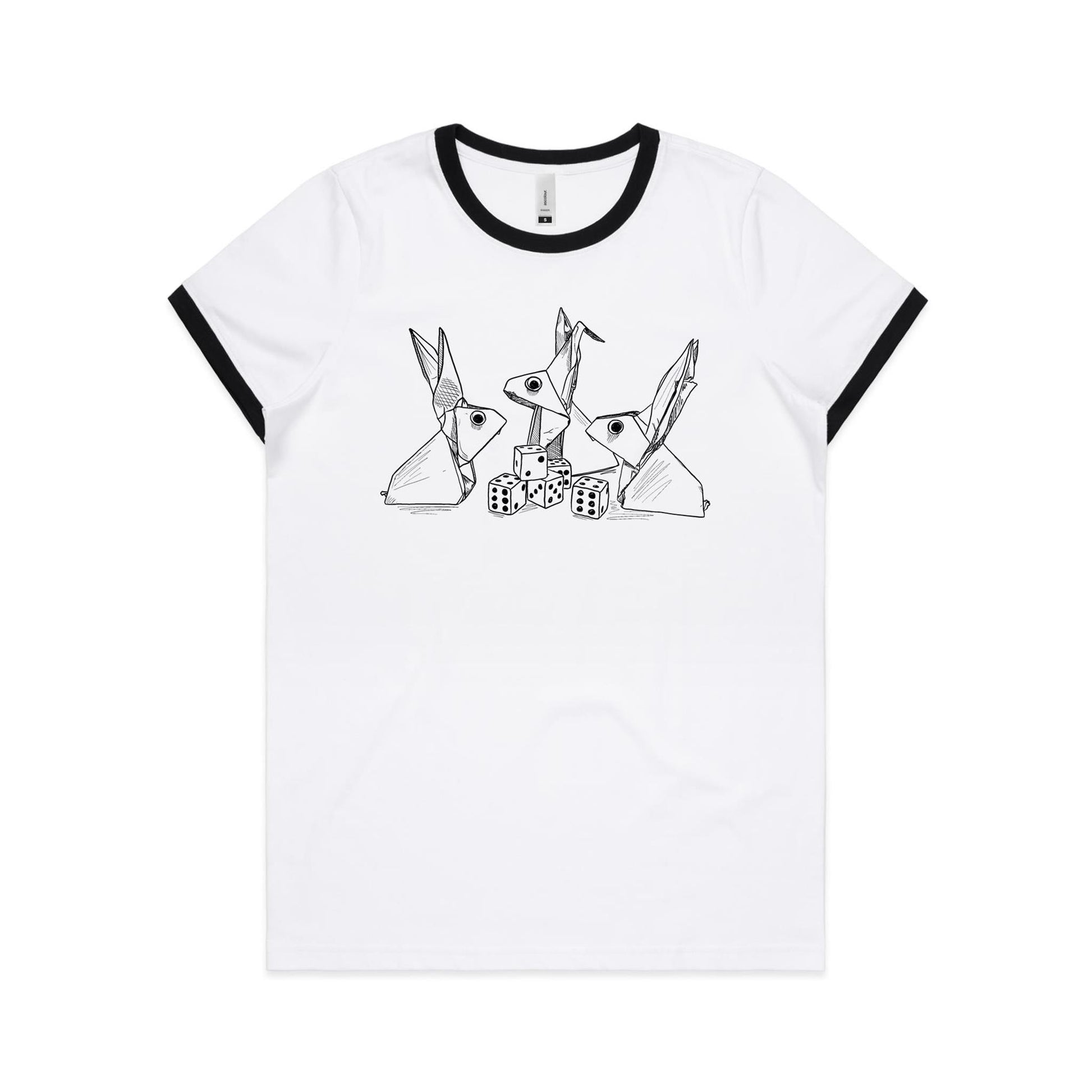 women’s ringer tee origami rabbits with dice